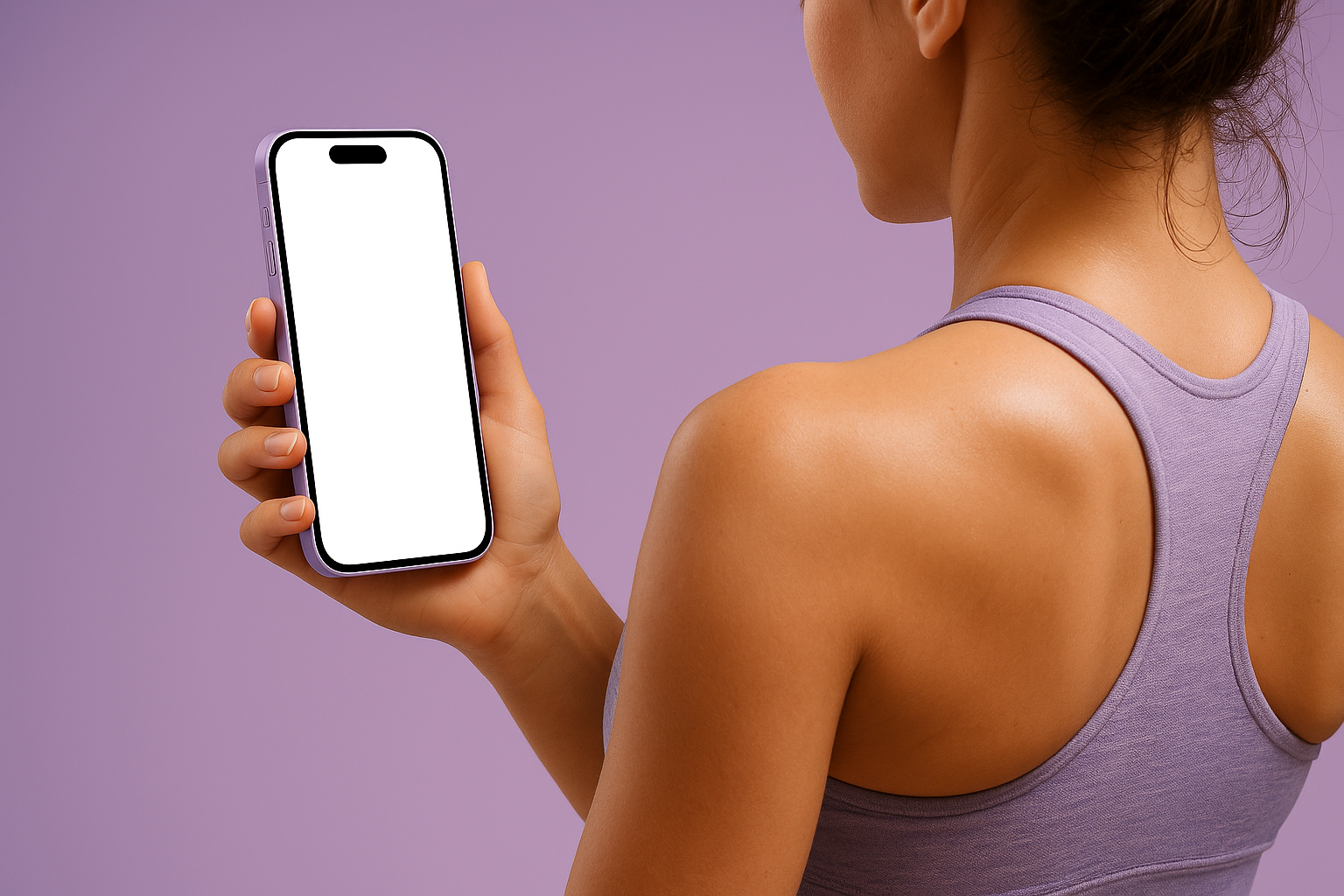 /Collection: /by davooda/Type: PNG/A dynamic shot of a woman in athletic wear holding a purple phone with a white screen, set against a soft purple backdrop. The image captures her from behind, emphasizing her sporty physique.