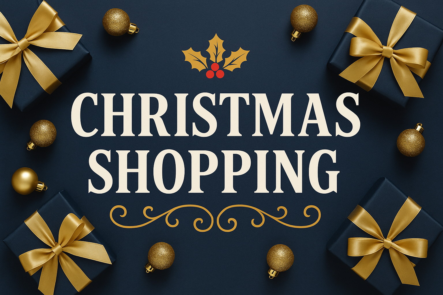 A vibrant promotional graphic showcasing Christmas shopping with elegant typography and decorative elements, ideal for holiday marketing campaigns.