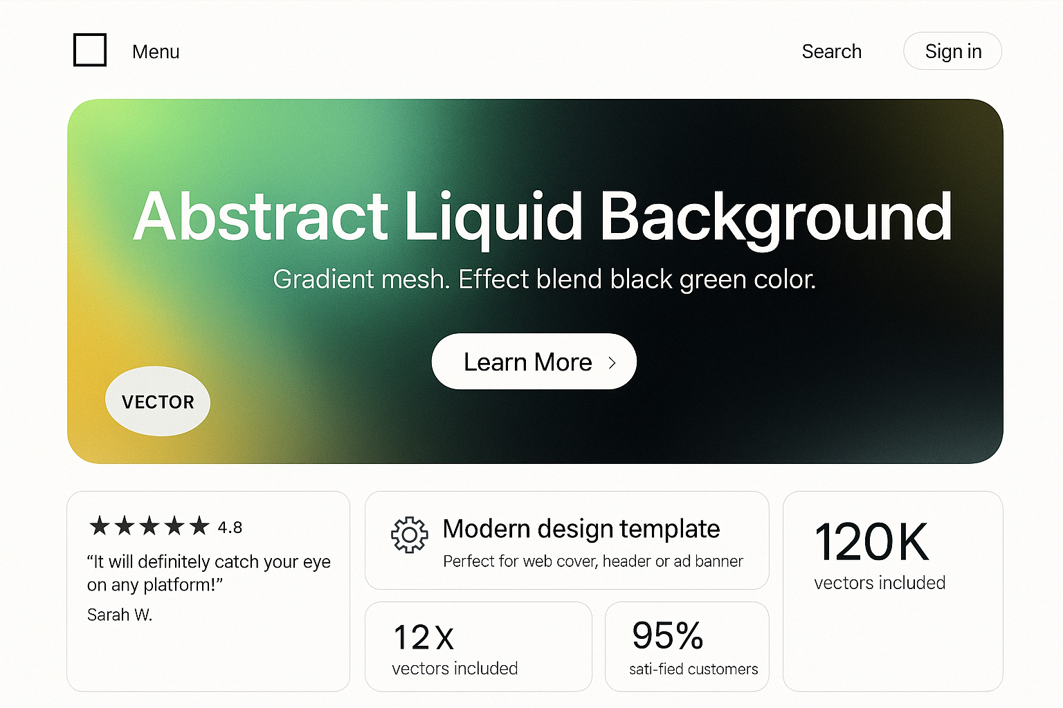 /Collection: /by davooda/Type: PNG/A modern landing page design featuring an abstract liquid background with a gradient blend of black and green colors. Includes a clean layout with small fonts and distinct visual elements.