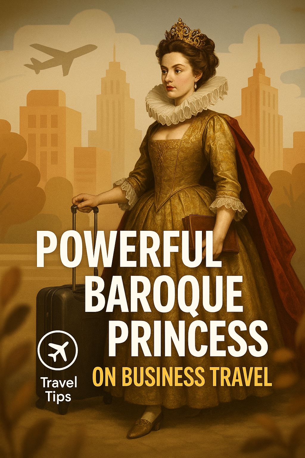 /Collection: /by davooda/Type: PNG/Creative social media post featuring a Baroque princess figure, symbolizing business travel with a blend of historical and contemporary styles. Ideal for travel tips or promotional content.