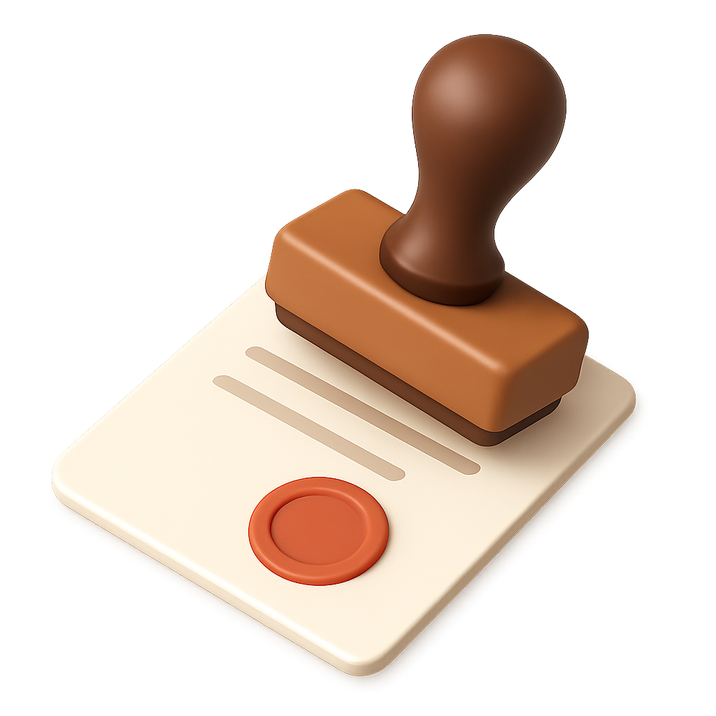 This image features a visually appealing 3D stamp icon resting on a document. The design showcases a brown handle and a stylized stamping base, all in a three-quarter view with a soft gradient background.
