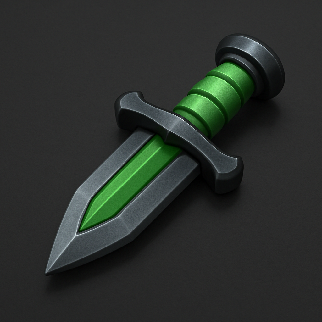 A detailed 3D icon of a dagger, featuring a striking green blade and dark gray handle. The design is sleek and modern, set against a dark gray background.