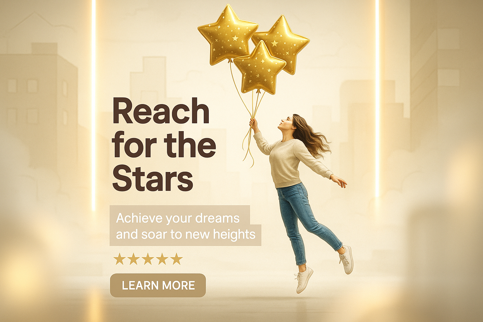 /Collection: /by davooda/Type: PNG/An uplifting promotional image featuring a woman holding gold star balloons, symbolizing dreams and aspirations. The soft color palette and light effects create a motivational atmosphere, ideal for personal development campaigns.