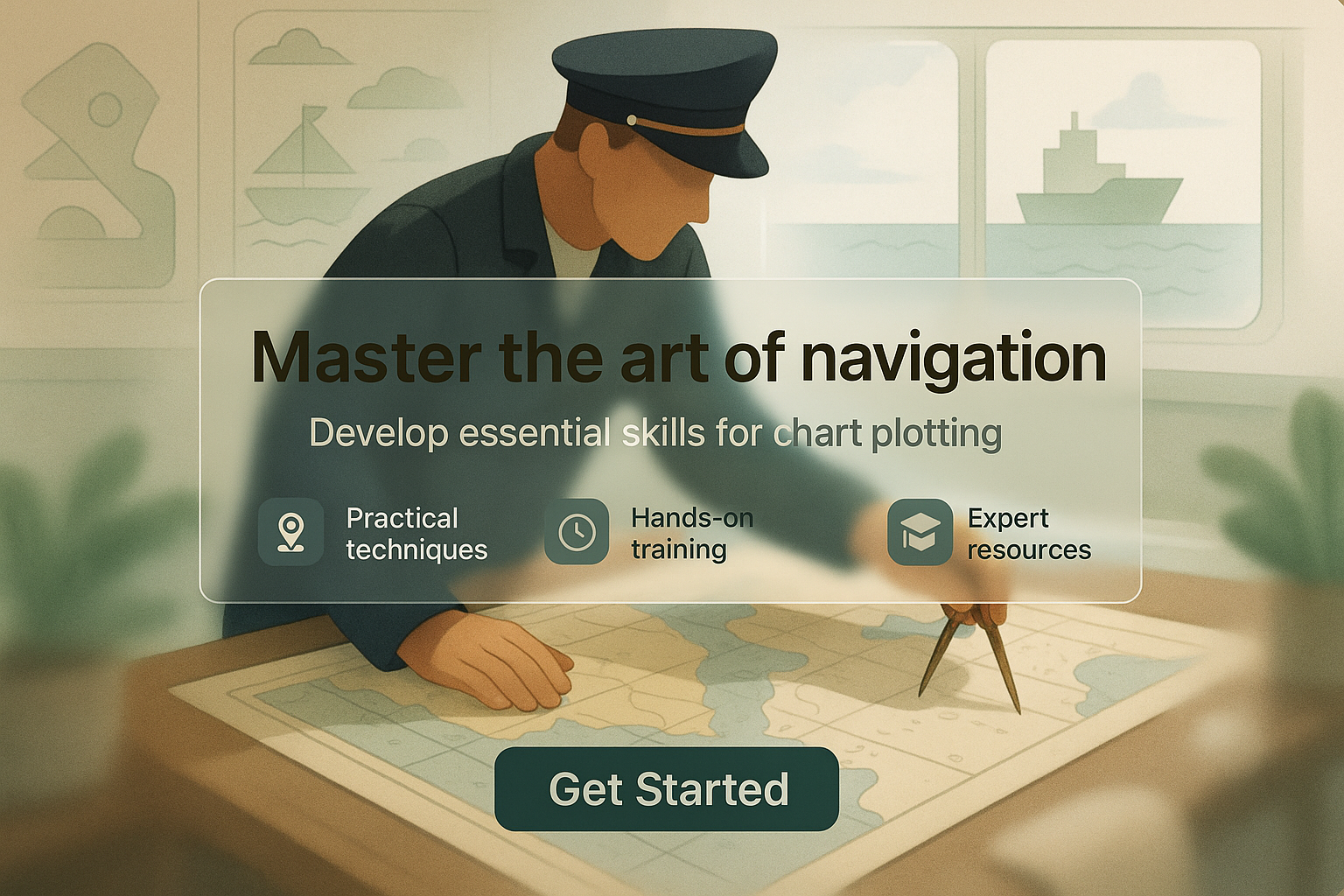 /Collection: /by davooda/Type: PNG/Engaging educational banner promoting navigation skills with a focus on practical techniques, featuring a sailor plotting a course. Ideal for maritime training programs.