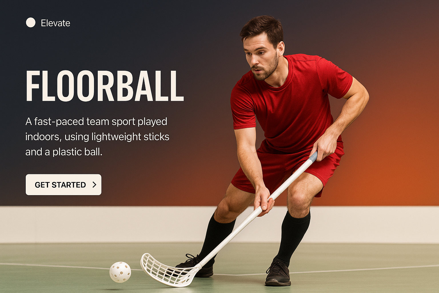 A modern web design concept for floorball featuring a player in action. The layout includes a gradient background and a clear call-to-action button.