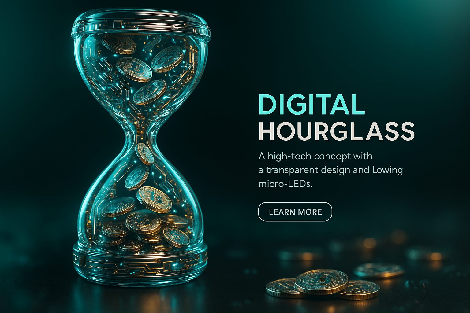 /Collection: /by davooda/Type: PNG/A hyperrealistic depiction of an hourglass filled with glowing crypto coins, crafted from transparent materials. It features intricate LED elements and reflective surfaces, emphasizing high-tech aesthetics.