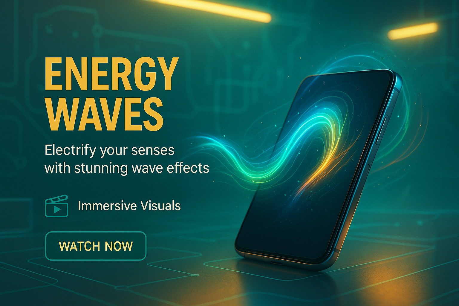 Vibrant promotional graphic showcasing a smartphone with energy wave effects, created for app marketing. Ideal for digital advertising and social media campaigns.