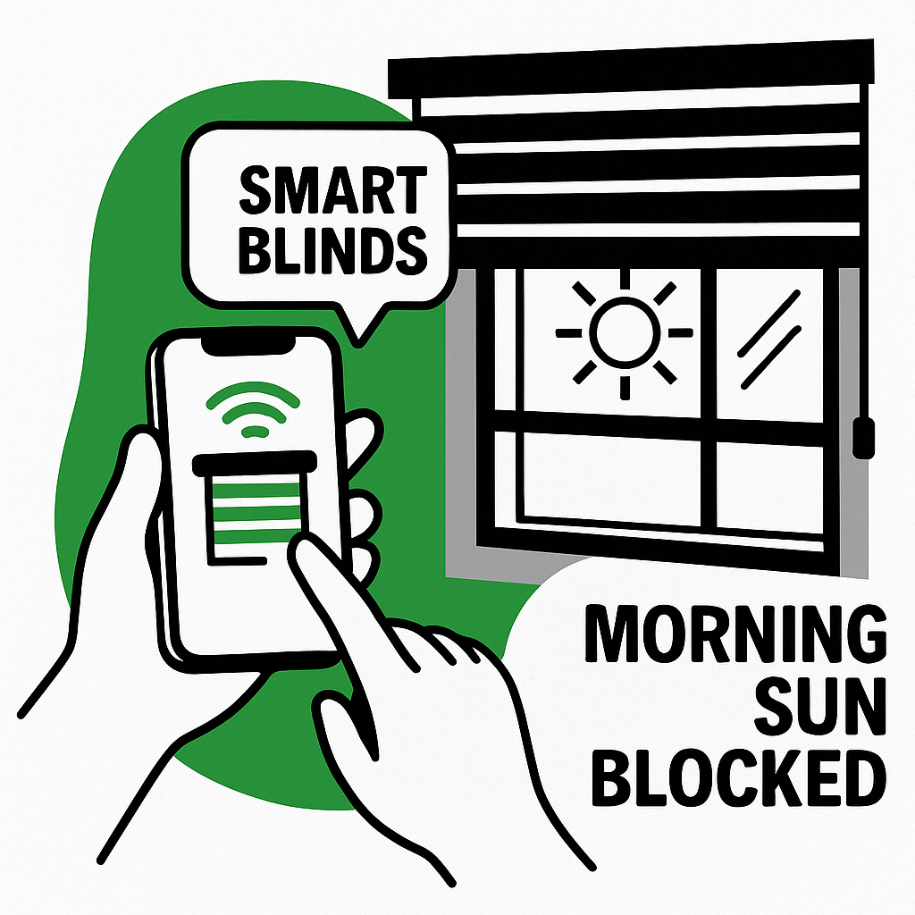 /Collection: /by davooda/Type: PNG/Vector graphic depicting smart blinds being controlled via a smartphone, emphasizing modern home automation. Ideal for technology and home improvement marketing.