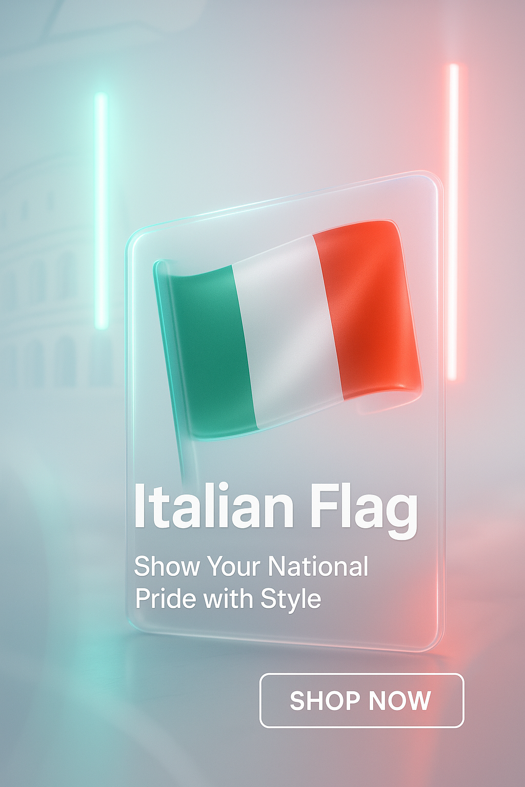 Modern promotional graphic featuring a waving Italian flag, designed with a vibrant aesthetic and glowing elements, ideal for e-commerce or national pride campaigns.