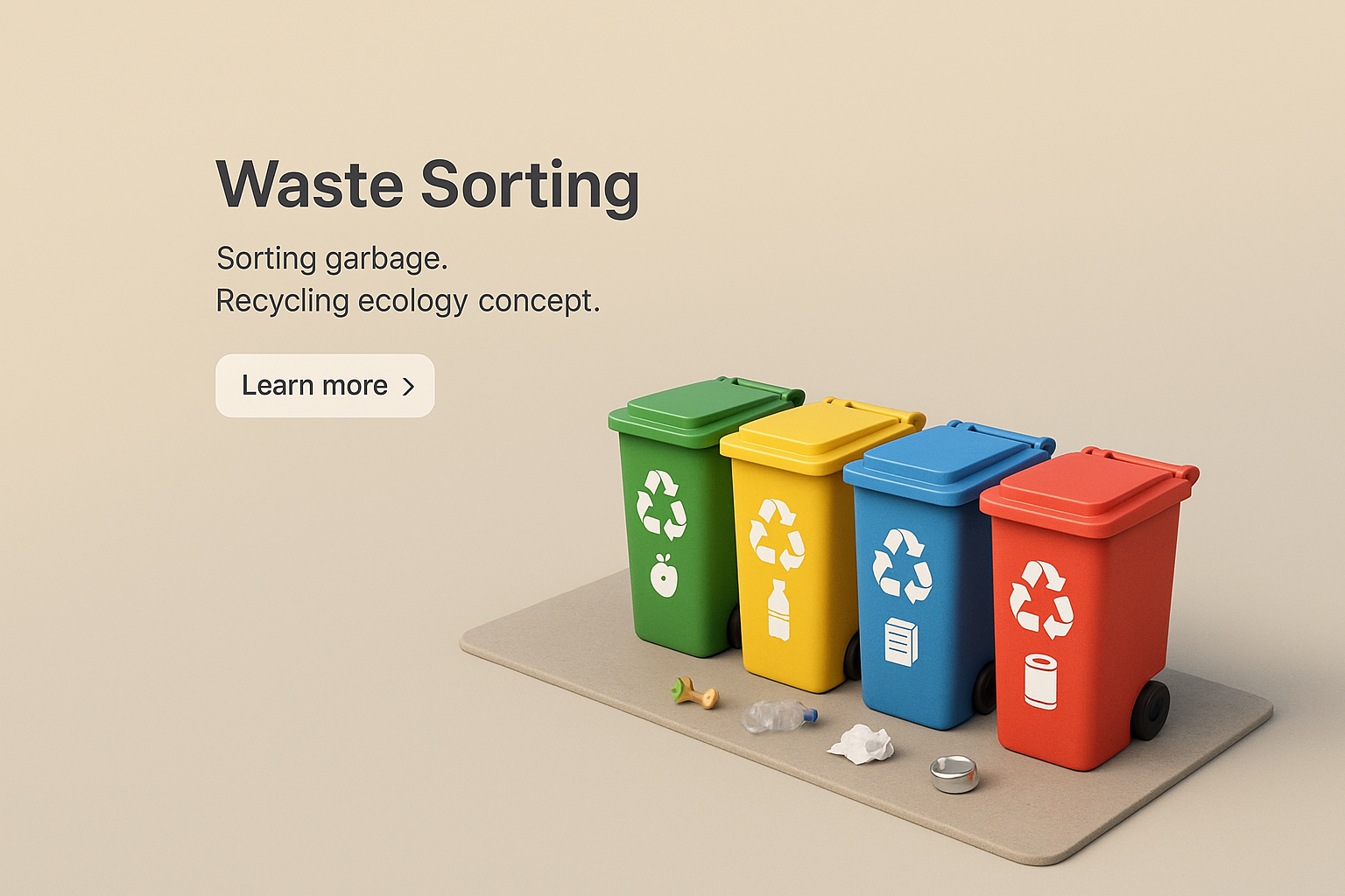 A visually appealing 3D scene showcasing colorful garbage bins for waste sorting. The design emphasizes recycling, featuring labels and text blocks in a cohesive layout.