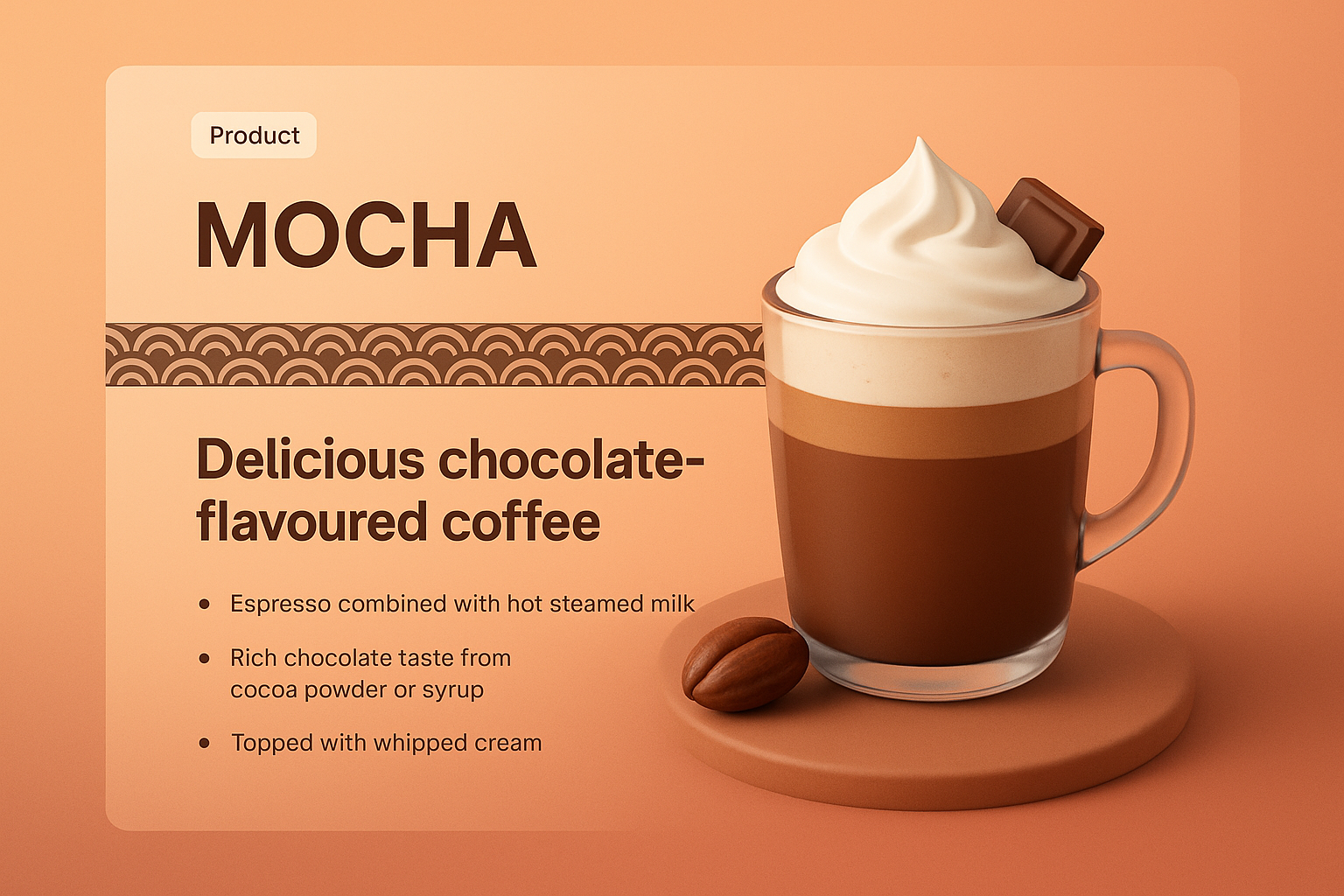 A visually appealing 3D illustration of mocha coffee in a glass, topped with whipped cream and chocolate. The background features a smooth gradient with decorative patterns.