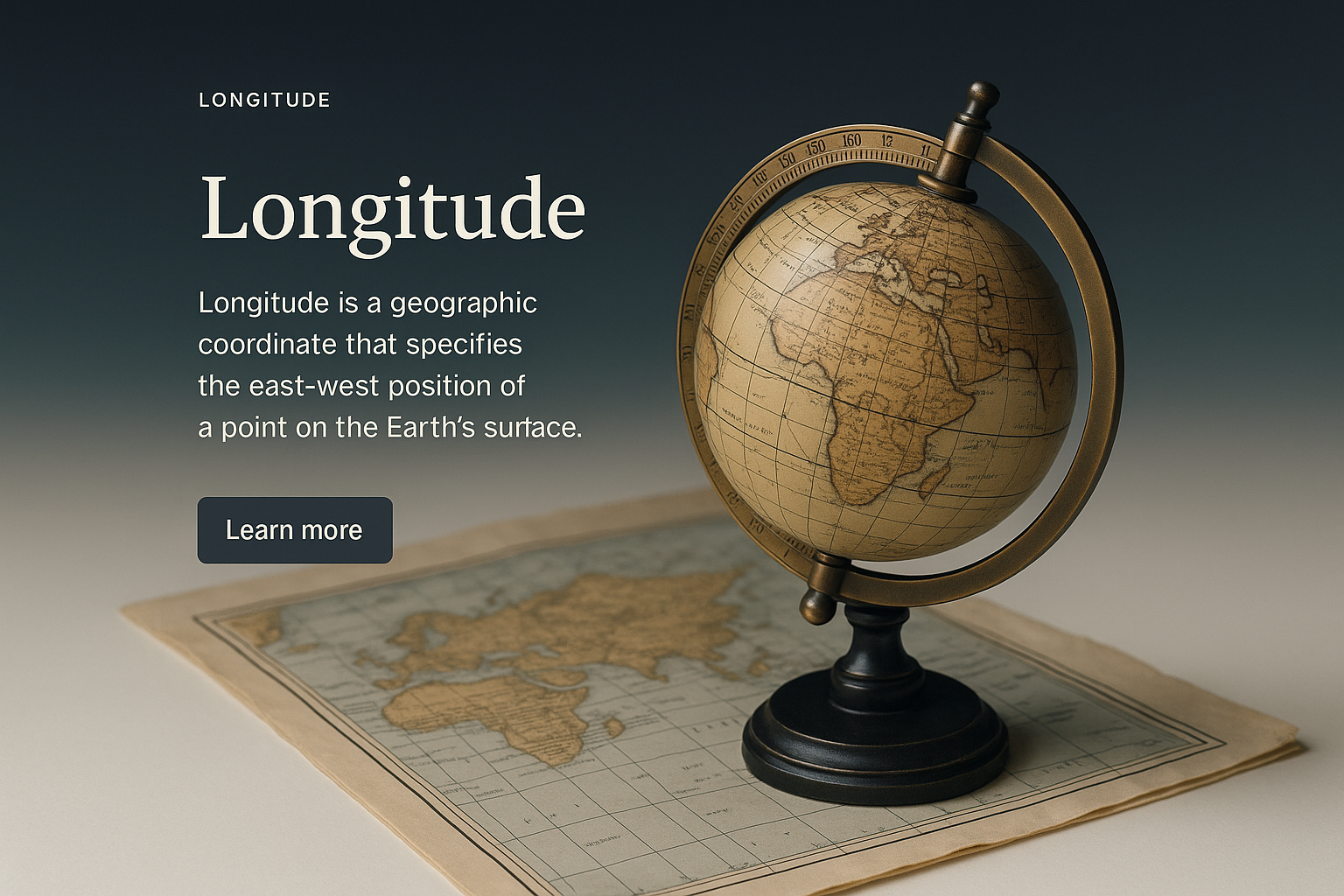 A stylish web design mockup showcasing a globe on a vintage map. The layout includes a title, a brief description, and a call-to-action button, all in a cohesive design.