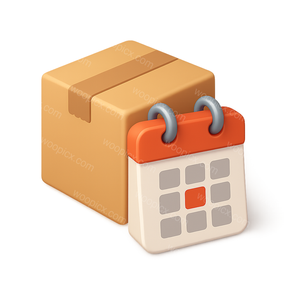 This image features a 3D calendar icon attached to a package, showcasing a modern design with a transparent background. The calendar has a vibrant color scheme and a three-quarter view.