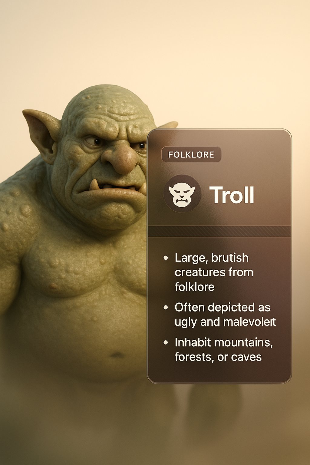 /Collection: /by davooda/Type: PNG/This image showcases a 3D troll character with a detailed overlay featuring folklore information. The design integrates a soft gradient background and transparent elements for a modern look.