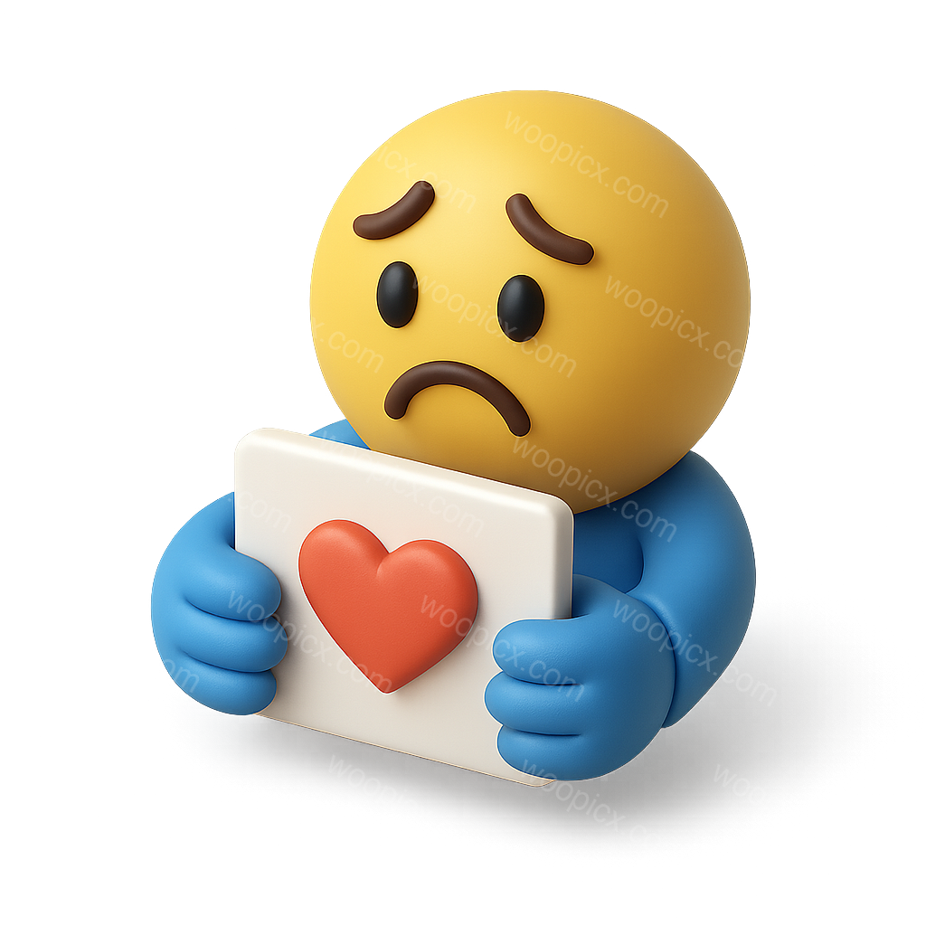 /Premium/Collection: /by davooda/Type: PNG/A 3D icon featuring a sad emoji holding a card with a heart symbol. The design is in a three-quarter view, showcasing a volumetric and isometric appearance.
