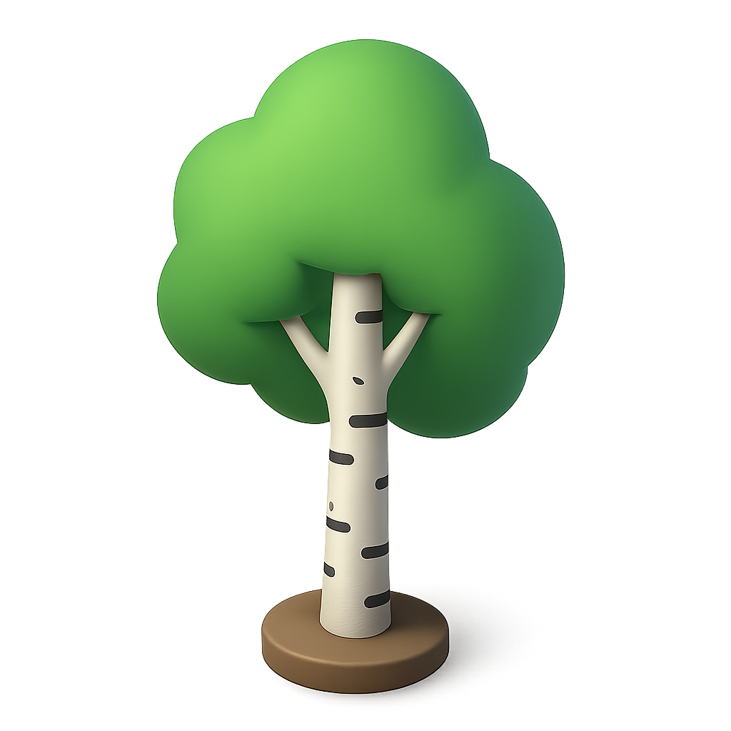 A visually appealing 3D icon of a birch tree featuring a white trunk with black markings and a lush green canopy. The tree is presented in a three-quarter isometric view, set against a soft gradient background.