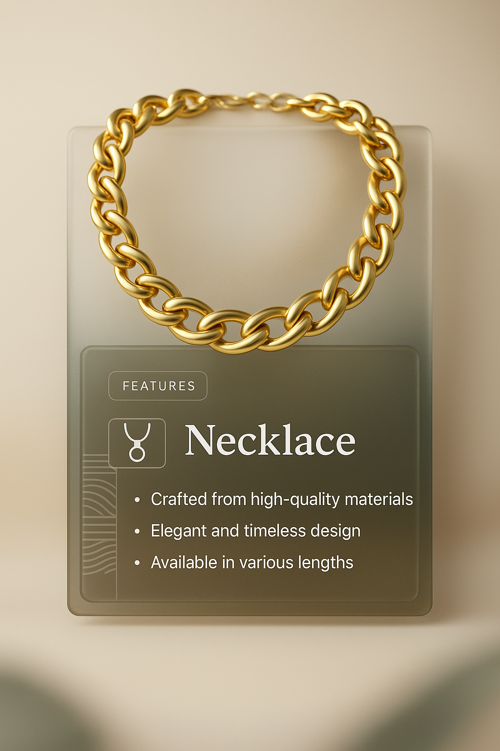 A beautifully crafted gold necklace displayed on a frosted glass panel. The panel highlights features like quality materials and elegant design, against a soft gradient background.
