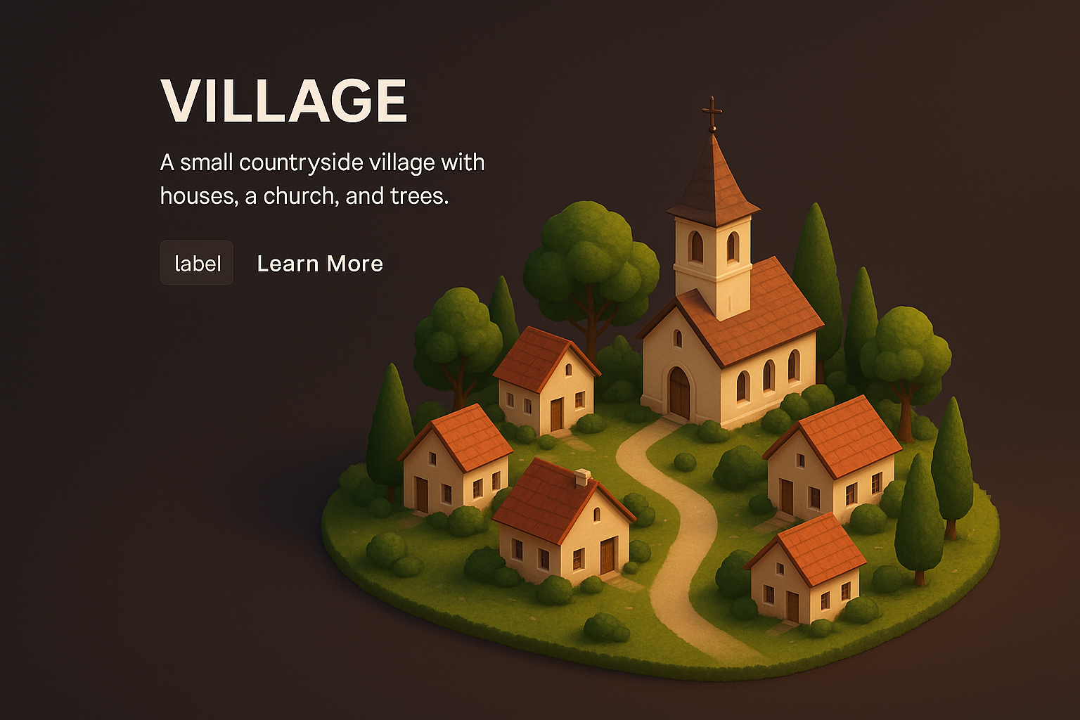 /Collection: /by davooda/Type: PNG/A detailed 3D illustration of a quaint village with houses, a church, and trees, set against a dark gradient background. The scene is designed with a zoomed-out perspective, showcasing the village layout.