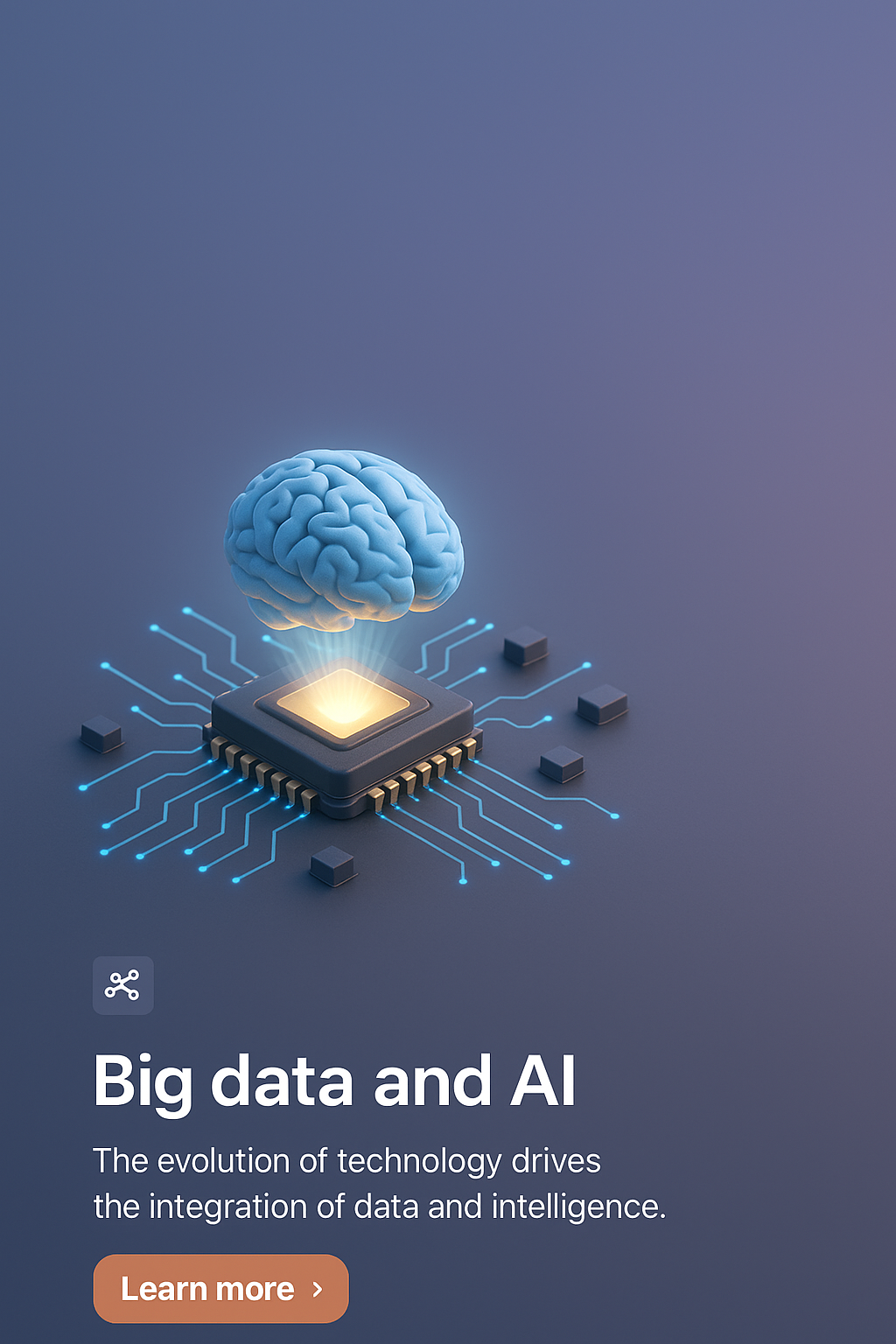 /Collection: /by davooda/Type: PNG/A captivating 3D representation of a glowing human brain above a processor, symbolizing the integration of big data and AI technology. The scene is designed to show the evolution of intelligence with a smooth gradient background.