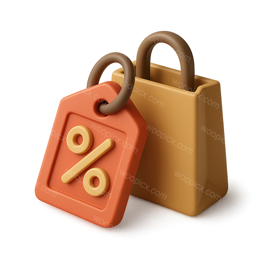 /Premium/Collection: /by davooda/Type: PNG/A vibrant 3D icon featuring a shopping bag alongside a discount tag, designed with a three-quarter view and a smooth, isometric style. The scene is set against a soft gradient background.
