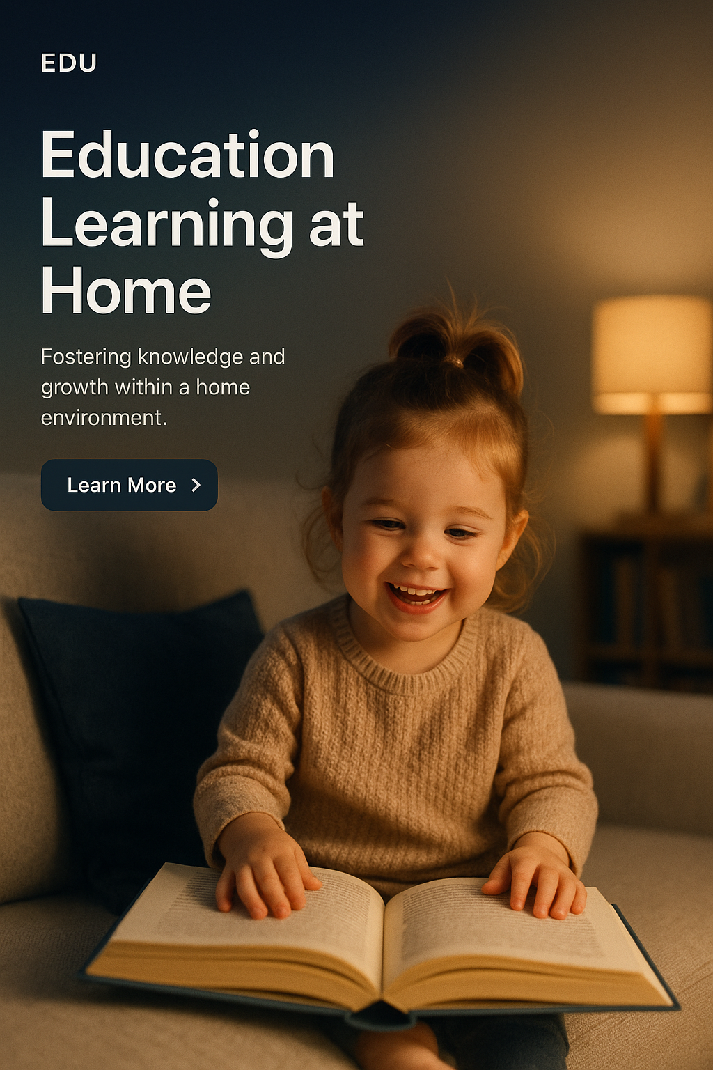 A joyful baby girl smiles while reading a book in a warmly lit living room. The cozy atmosphere emphasizes learning and growth in a home setting.