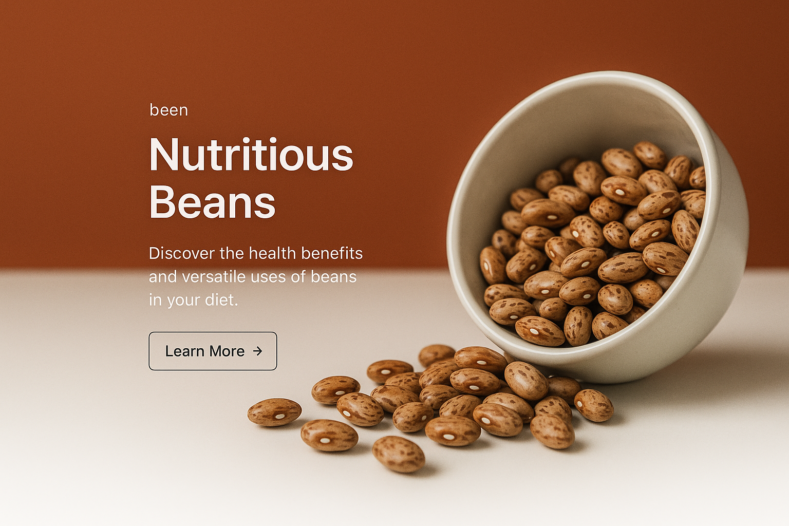 A web interface design showcasing a bowl of beans against a warm background. Features small text labels, a brief description, and a prominent action button, all arranged cohesively.