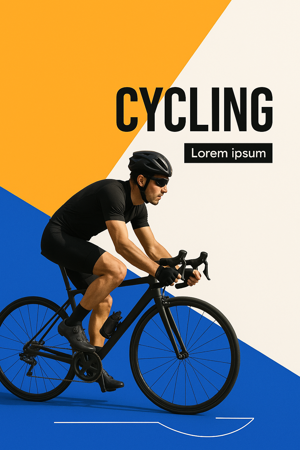 A dynamic and structured cycling scene featuring a cyclist in motion. The background is divided into three distinct color blocks, creating a clean and energetic visual.