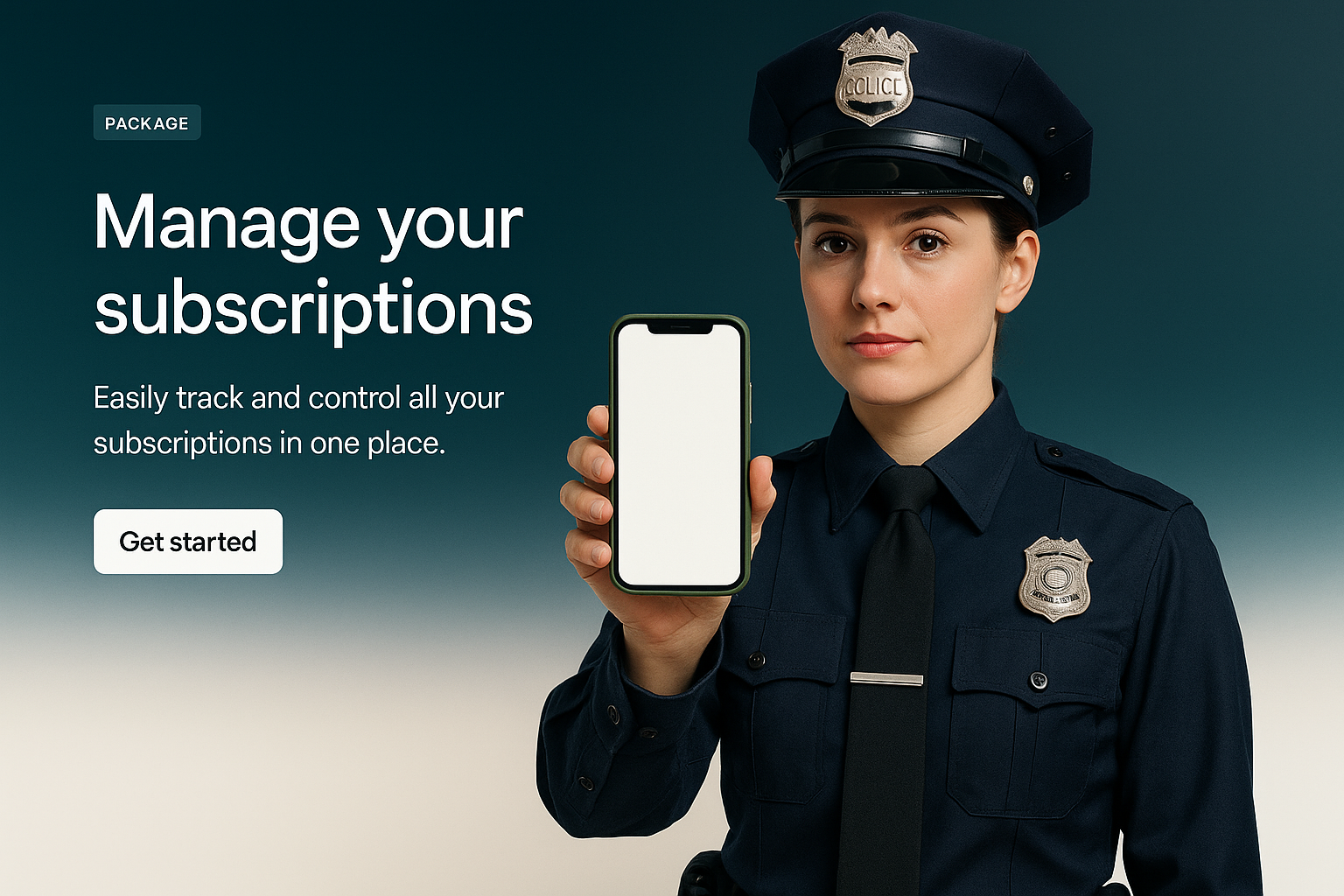 /Collection: /by davooda/Type: PNG/A police officer in uniform holds a smartphone displaying a blank screen, promoting subscription management services. The background features a gradient from dark to white.