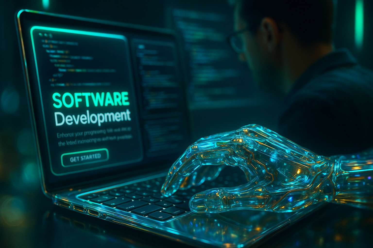 /Collection: /by davooda/Type: PNG/A programmer working on software development with a glowing, transparent robotic hand typing on a laptop. The background features neon accents and abstract elements, creating a high-tech aesthetic.