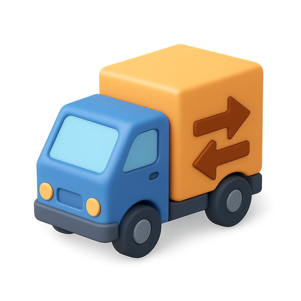 /Collection: /by davooda/Type: PNG/A visually appealing 3D icon of a delivery truck featuring a bright blue cab and an orange cargo box with directional arrows. The design has a transparent background and a three-quarter view for a volumetric effect.