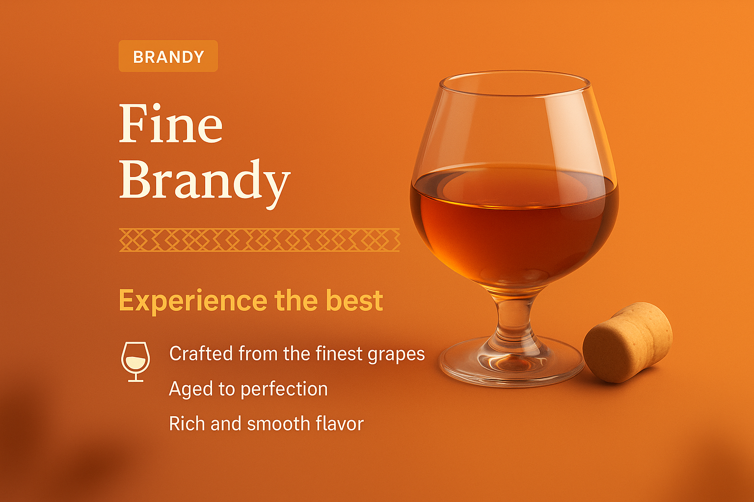 /Collection: /by davooda/Type: PNG/A sophisticated landing page design featuring a 3D illustration of fine brandy in a glass, highlighting its rich flavors. The layout includes stylish text blocks and a patterned strip.