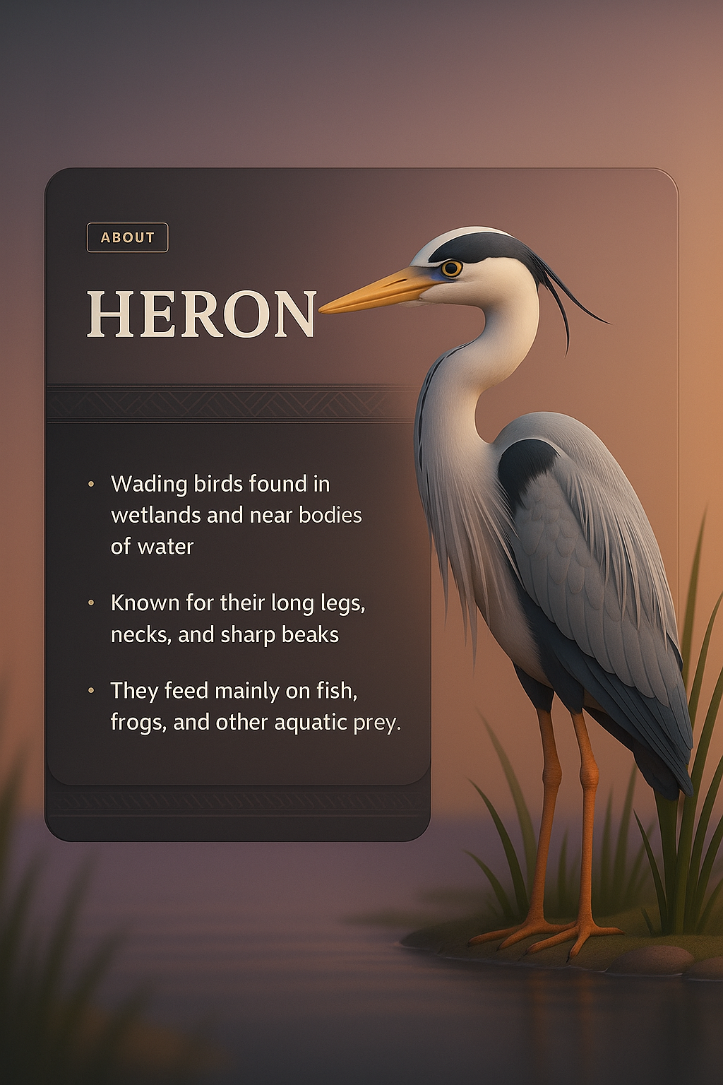 A 3D illustration featuring a heron standing gracefully in a wetland, accompanied by a dark design block with informative text about the bird's habitat and feeding habits.