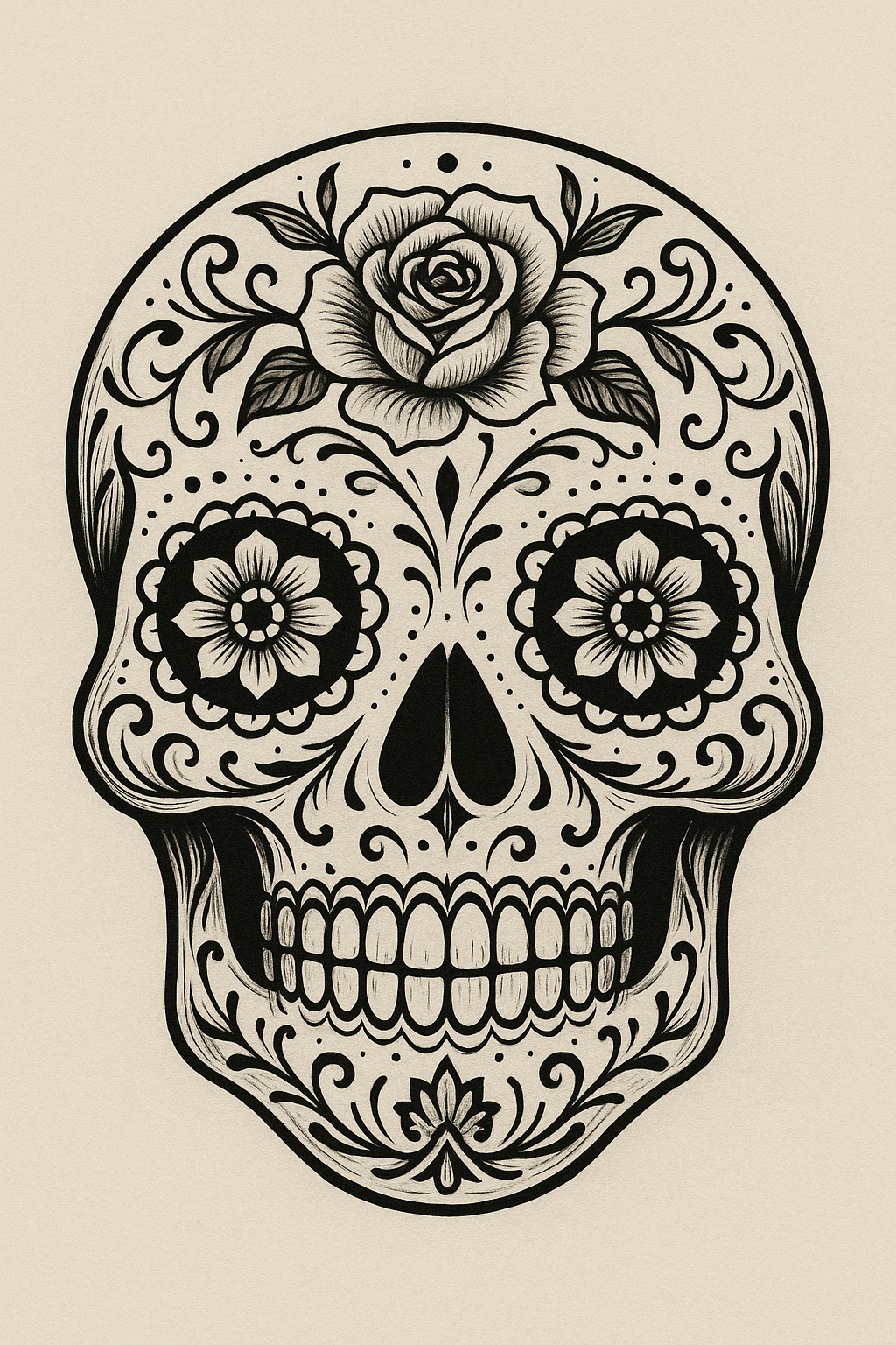Intricate Skull and Rose Artwork for Tattoo or Decorative Use
