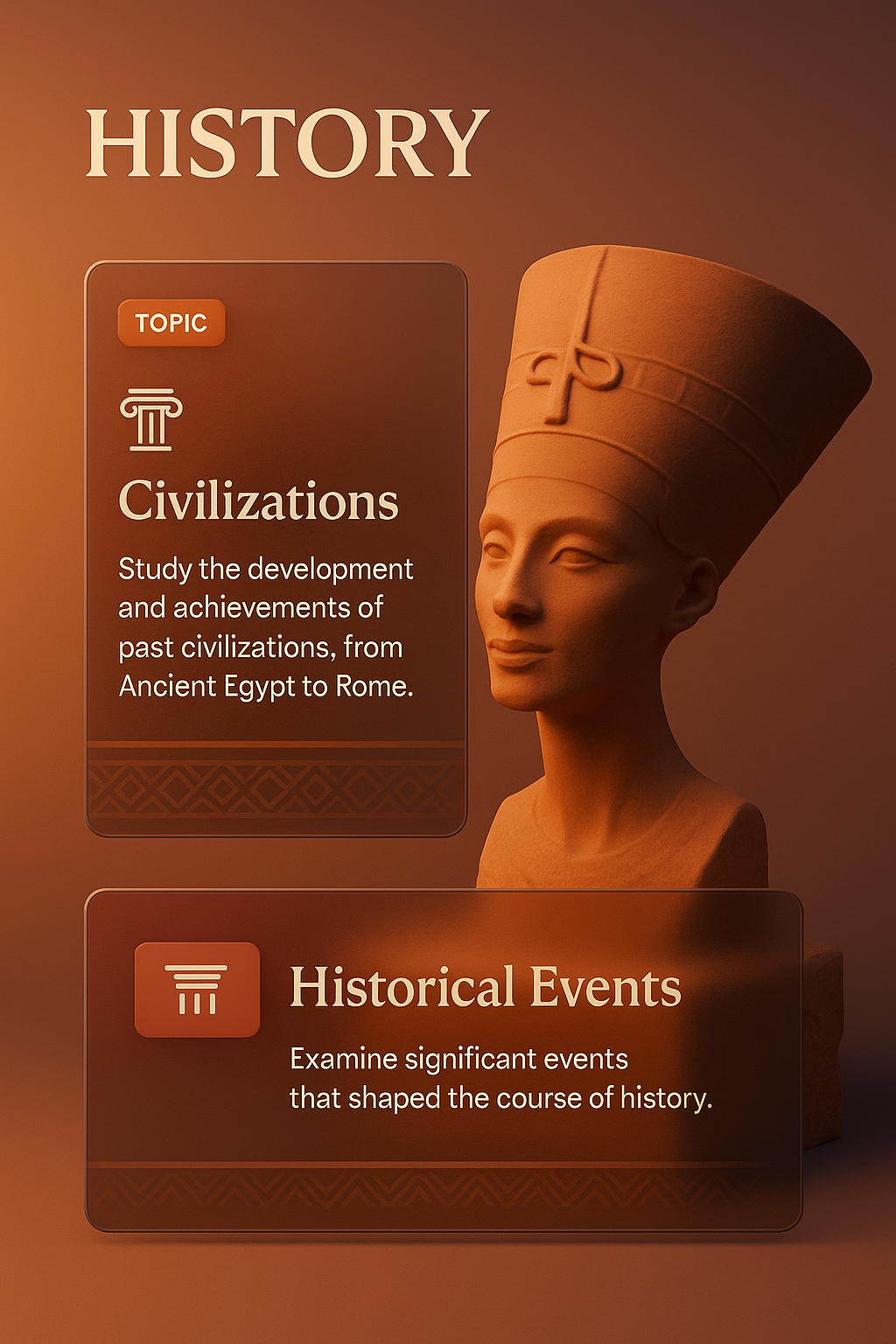 /Collection: /by davooda/Type: PNG/The image showcases a 3D illustration of a historical figure with blocks highlighting topics on civilizations and events. The design features a gradient background and well-integrated text.