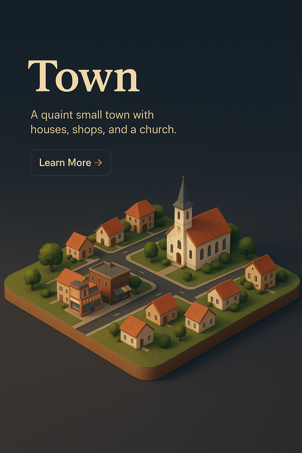 A zoomed-out 3D depiction of a small town featuring houses, shops, and a church, set against a dark gradient background. The layout emphasizes realism and cohesion in design.