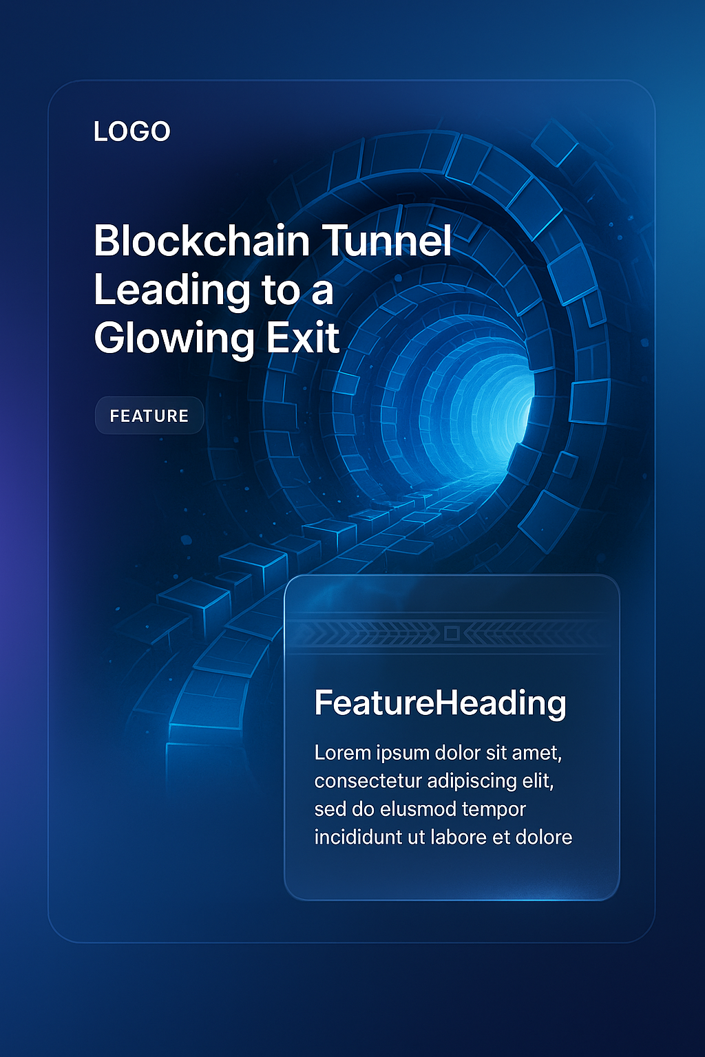 A 3D illustration of a blockchain tunnel leading to a glowing exit, featuring a sleek design with layered elements. The foreground includes a feature box with a title and graphic elements.