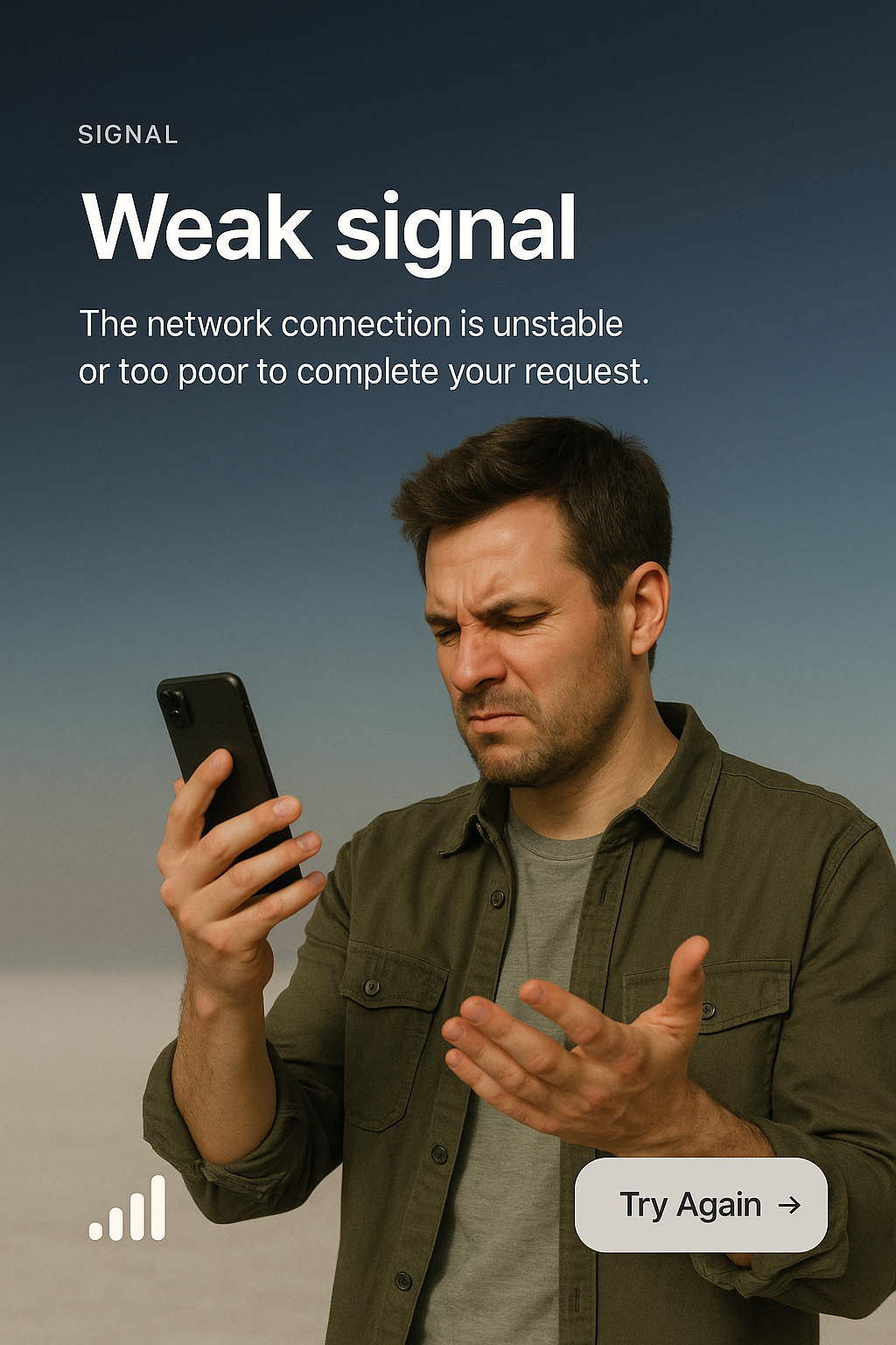 /Collection: /by davooda/Type: PNG/A stylish minimalist web page design featuring a notification about weak network signal. The layout includes a small label, a brief headline, a text block, and an action button.