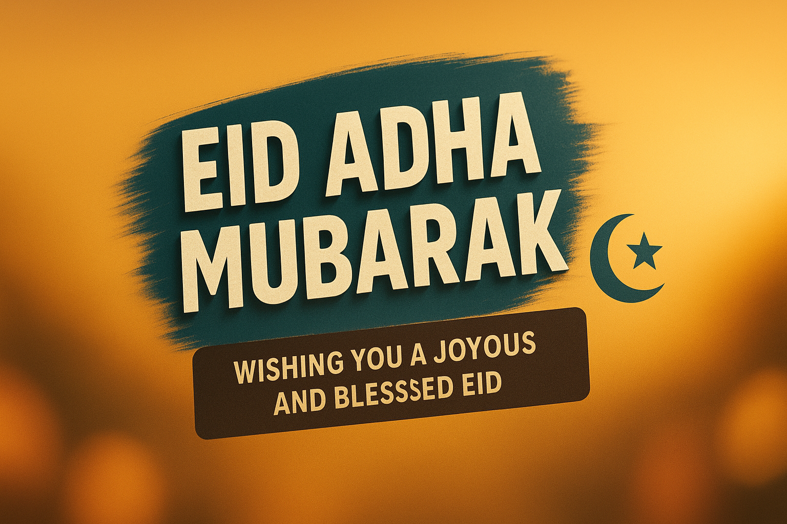 Vibrant greeting card design celebrating Eid Adha, featuring bold typography and a warm color palette, suitable for social media posts or digital invitations.