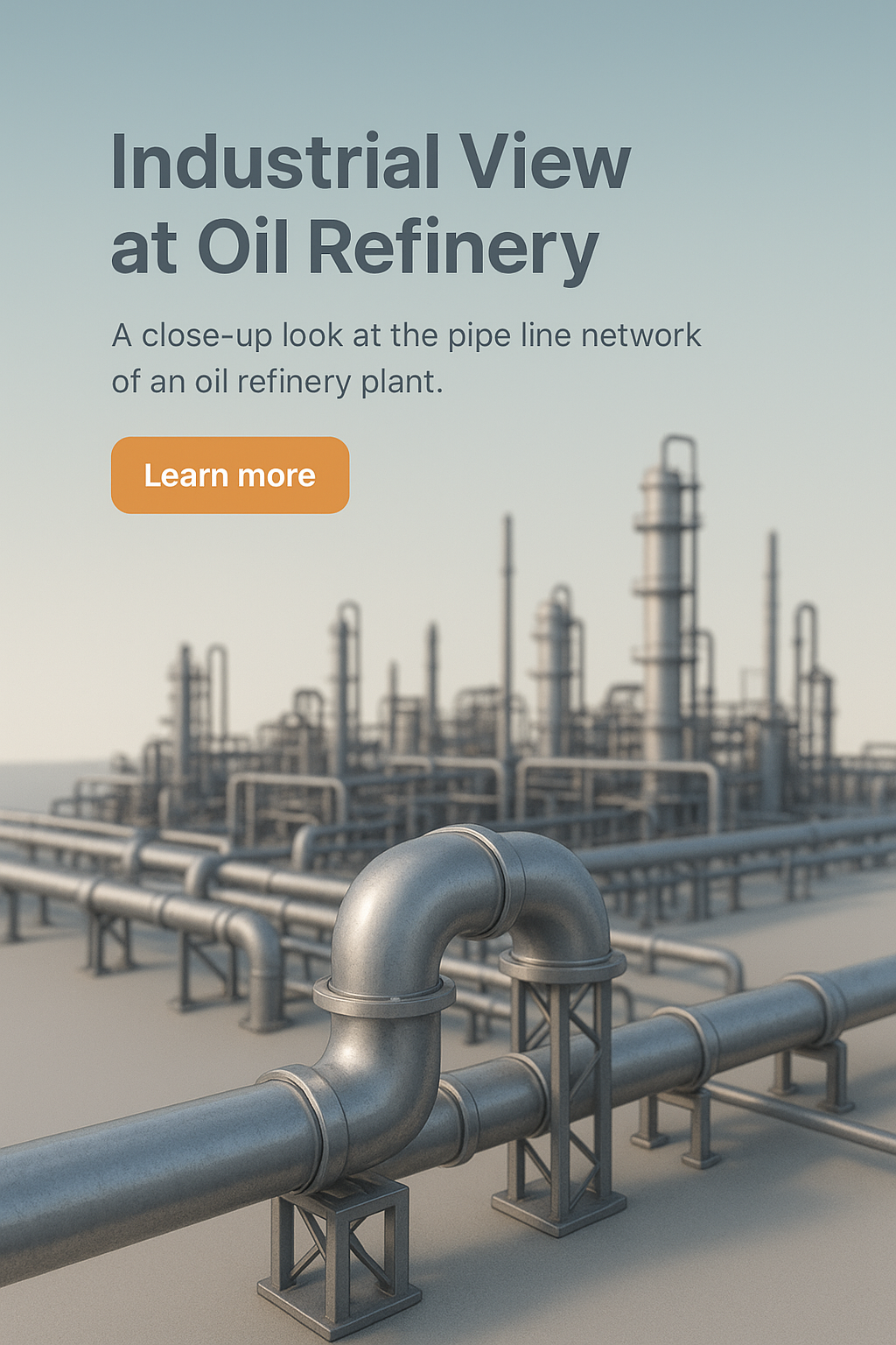 A zoomed-out perspective of an oil refinery showcasing intricate pipeline networks. The scene features a gradient background and well-structured visual elements.