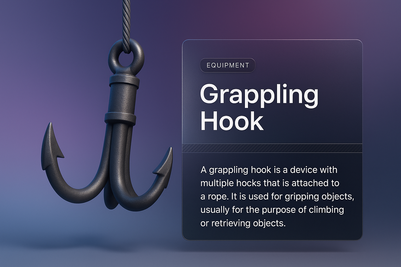 /Collection: /by davooda/Type: PNG/A sleek 3D illustration of a grappling hook, featuring a dark overlay panel with descriptive text. The background transitions smoothly from gradient to solid color, enhancing visual appeal.