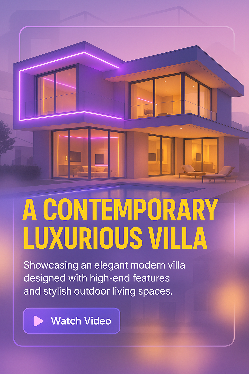 Visually striking promotional graphic featuring a contemporary villa design with elegant architecture, perfect for real estate marketing and video promotion.