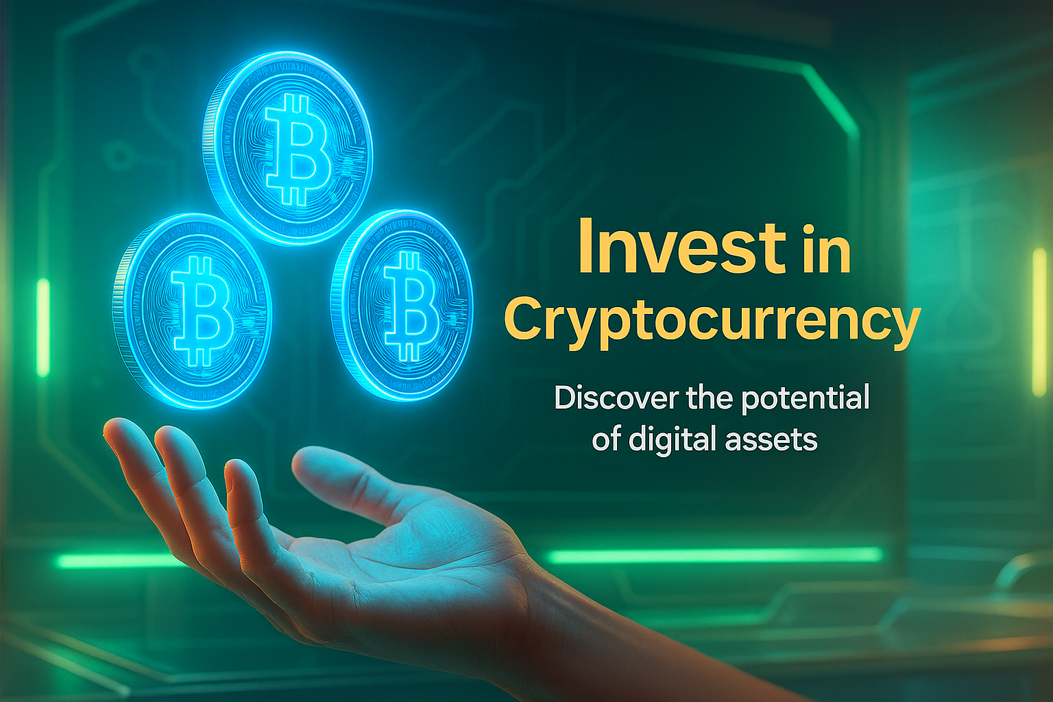 /Collection: /by davooda/Type: PNG/A modern promotional graphic showcasing cryptocurrency with glowing coin visuals and a hand reaching out, ideal for digital marketing campaigns targeting investors in digital assets.