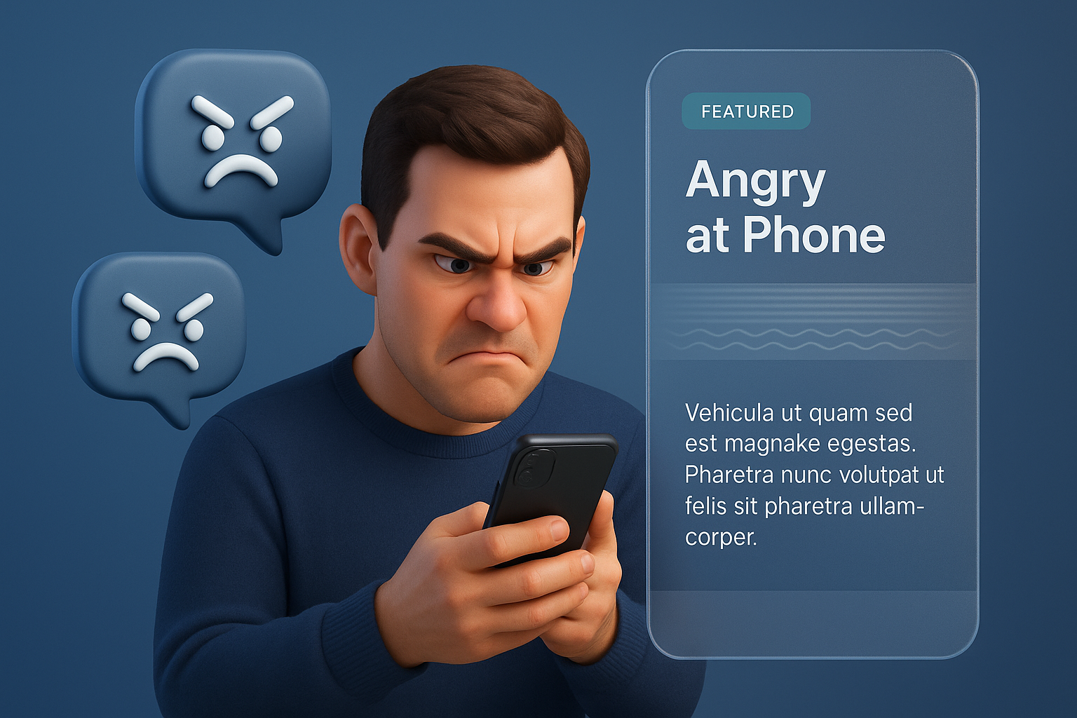 A man with a frustrated expression looks at his phone, surrounded by angry chat bubbles. The background features a smooth gradient, and there is a styled text block alongside him.