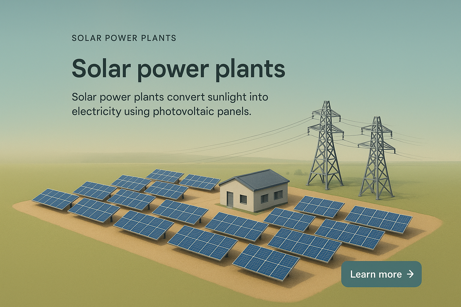 /Collection: /by davooda/Type: PNG/A zoomed-out view of a realistic 3D solar power plant scene featuring photovoltaic panels, a house, and power lines. The design integrates a smooth gradient background.
