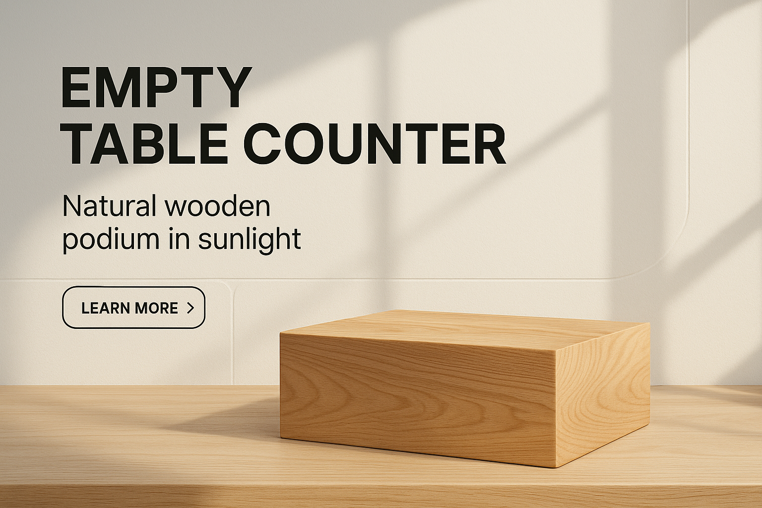 An empty wooden table counter showcasing beautiful wood grain under sunlight. The minimalist design features geometric backgrounds and bold typography for a modern aesthetic.