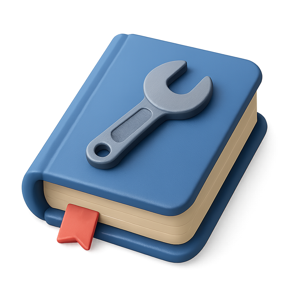 A 3D rendered image featuring a blue book with a wrench placed on top. The book has a red bookmark peeking out, adding a vibrant detail to the composition.