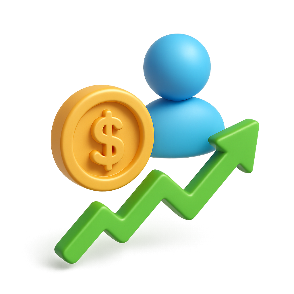 /Collection: /by davooda/Type: PNG/A visually appealing 3D icon depicting customer lifetime value. The icon features a blue figure, a yellow dollar sign, and a green upward trend graph, all presented in an isometric style.
