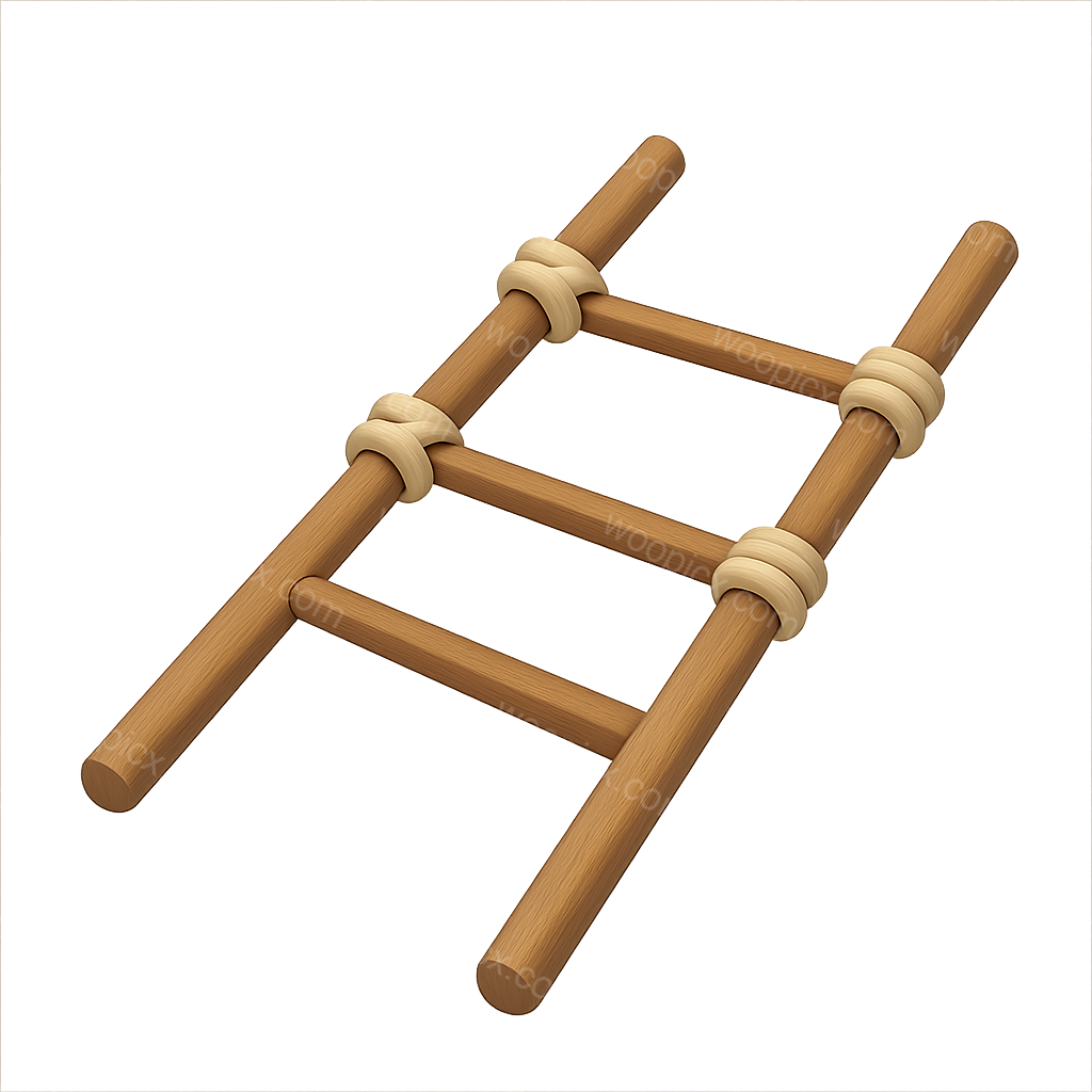 A detailed 3D representation of a wooden ladder, featuring distinct wooden beams and rope bindings. The design showcases a realistic texture and depth, suitable for digital applications.