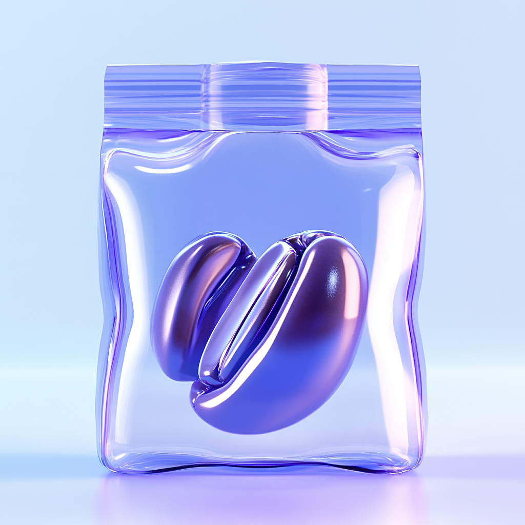 Stylized 3D rendering showcasing glossy coffee beans inside a clear, modern packaging bag. Ideal for coffee branding and product promotion.
