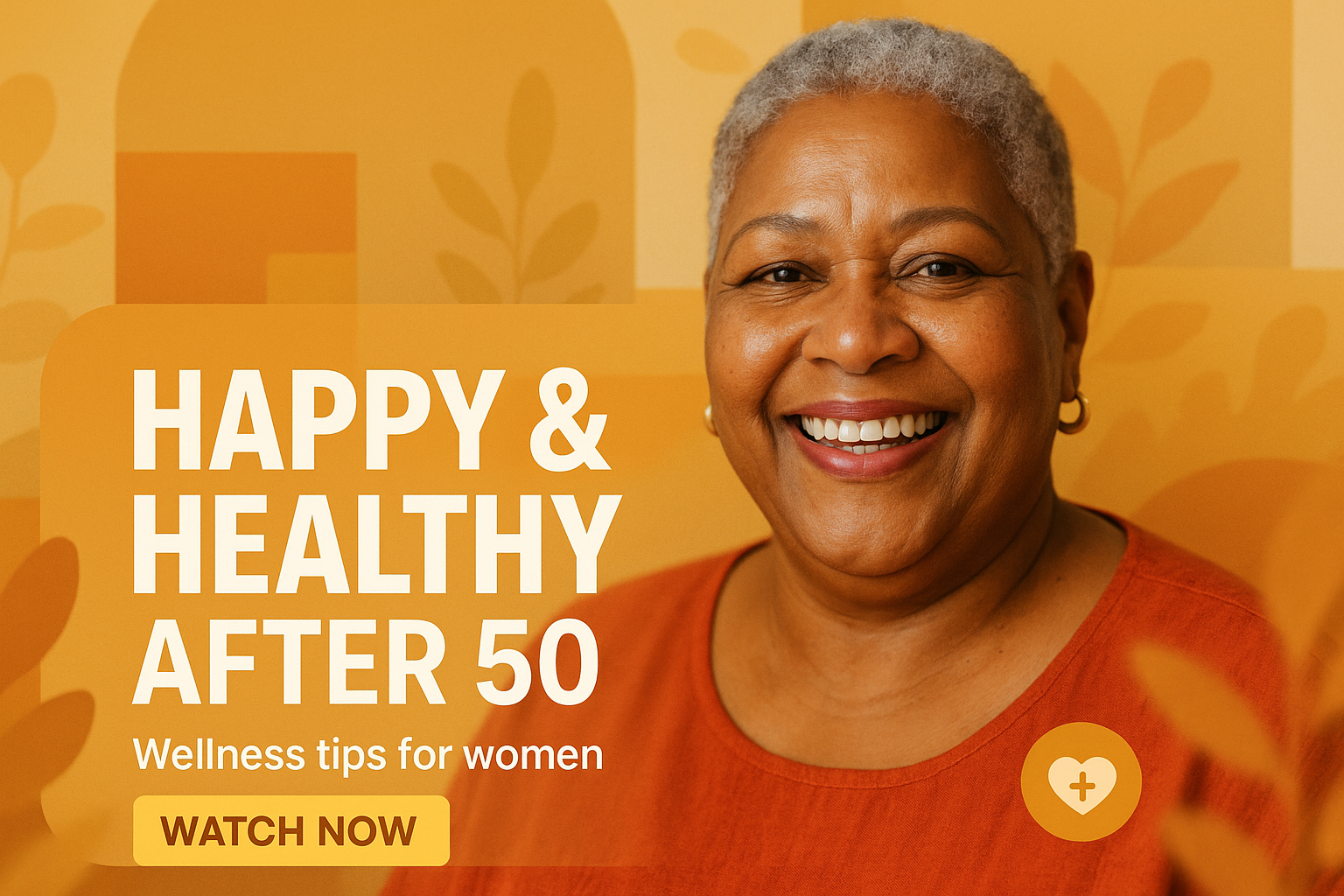 Engaging social media post promoting wellness tips for women over 50, featuring a cheerful older woman against a warm background. Ideal for health-focused campaigns.